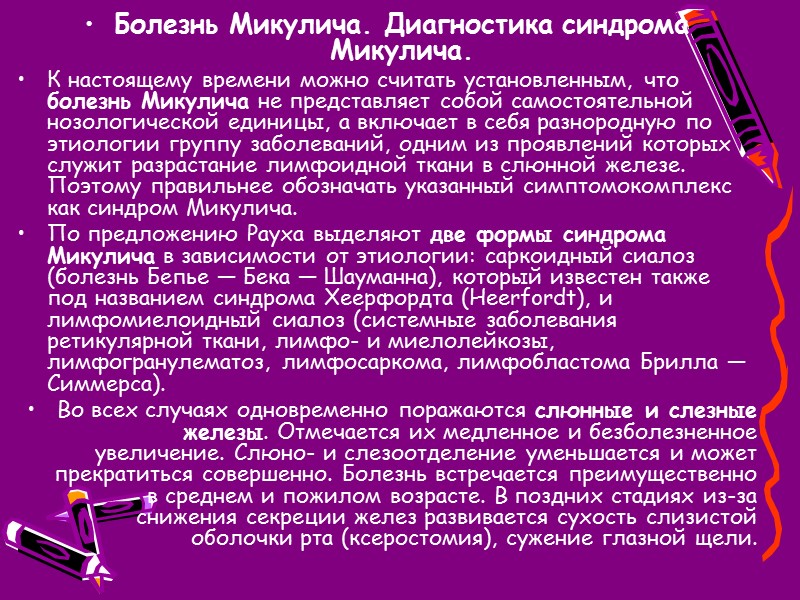 Болезнь Микулича. Диагностика синдрома Микулича. К настоящему времени можно считать установленным, что болезнь Микулича не представляет собой самостоятельной нозологической единицы, а включает в себя разнородную по этиологии группу заболеваний, одним из проявлений которых служит разрастание лимфоидной ткани в слюнной железе. Поэтому правильнее обозначать указанный симптомокомплекс как синдром Микулича. По предложению Рауха выделяют две формы синдрома Микулича в зависимости от этиологии: саркоидный сиалоз (болезнь Бепье — Бека — Шауманна), который известен также под названием синдрома Хеерфордта (Heerfordt), и лимфомиелоидный сиалоз (системные заболевания ретикулярной ткани, лимфо- и миелолейкозы, лимфогранулематоз, лимфосаркома, лимфобластома Брилла — Симмерса). Во всех случаях одновременно поражаются слюнные и слезные железы. Отмечается их медленное и безболезненное увеличение. Слюно- и слезоотделение уменьшается и может прекратиться совершенно. Болезнь встречается преимущественно в среднем и пожилом возрасте. В поздних стадиях из-за снижения секреции желез развивается сухость слизистой оболочки рта (ксеростомия), сужение глазной щели.
