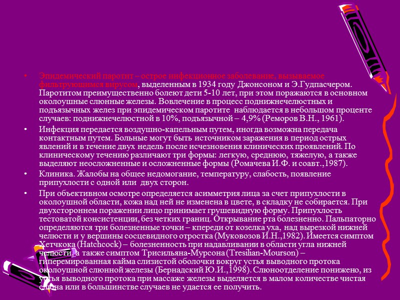 Эпидемический паротит – острое инфекционное заболевание, вызываемое фильтрующимся вирусом, выделенным в 1934 году Джонсоном и Э.Гудпасчером. Паротитом преимущественно болеют дети 5-10 лет, при этом поражаются в основном околоушные слюнные железы. Вовлечение в процесс поднижнечелюстных и подъязычных желез при эпидемическом паротите наблюдается в небольшом проценте случаев: поднижнечелюстной в 10%, подъязычной – 4,9% (Реморов В.Н., 1961). Инфекция передается воздушно-капельным путем, иногда возможна передача контактным путем. Больные могут быть источником заражения в период острых явлений и в течение двух недель после исчезновения клинических проявлений. По клиническому течению различают три формы: легкую, среднюю, тяжелую, а также выделяют неосложненные и осложненные формы (Ромачева И.Ф. и соавт.,1987). Клиника. Жалобы на общее недомогание, температуру, слабость, появление припухлости с одной или двух сторон. При объективном осмотре определяется асимметрия лица за счет припухлости в околоушной области, кожа над ней не изменена в цвете, в складку не собирается. При двухстороннем поражении лицо принимает грушевидную форму. Припухлость тестоватой консистенции, без четких границ. Открывание рта болезненно. Пальпаторно определяются три болезненные точки – кпереди от козелка уха, над вырезкой нижней челюсти и у вершины сосцевидного отростка (Муковозов И.Н.,1982). Имеется симптом Хетчкока (Hatchcock) – болезненность при надавливании в области угла нижней челюсти, а также симптом Трисильяна-Мурсона (Tresilian-Mourson) – гиперемированная кайма слизистой оболочки вокруг устья выводного протока околоушной слюнной железы (Бернадский Ю.И.,1998). Слюноотделение понижено, из устья выводного протока при массаже железы выделяется в малом количестве чистая слюна или в большинстве случаев не удается ее получить.