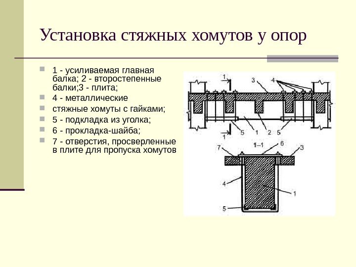 Установка стяжных хомутов у опор 1 — усиливаемая главная балка; 2 — второстепенные балки; 3 — плита; 4 — металлические стяжные хомуты с гайками; 5 — подкладка из уголка; 6 — прокладка-шайба; 7 — отверстия, просверленные в плите для пропуска хомутов