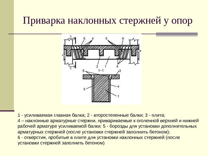 Приварка наклонных стержней у опор 1 — усиливаемая главная балка; 2 — второстепенные балки; 3 — плита; 4 – наклонные арматурные стержни, приваемые к оголенной верхней и нижней рабочей арматуре усиливаемой балки; 5 — борозды для установки дополнительных арматурных стержней (после установки стержней заполнить бетоном); 6 — отверстия, пробитые в плите для установки наклонных стержней (после установки стержней заполнить бетоном)