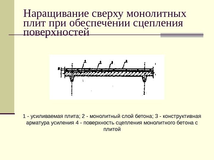 Наращивание сверху монолитных плит при обеспечении сцепления поверхностей 1 — усиливаемая плита; 2 — монолитный слой бетона; 3 — конструктивная арматура усиления 4 — поверхность сцепления монолитного бетона с плитой