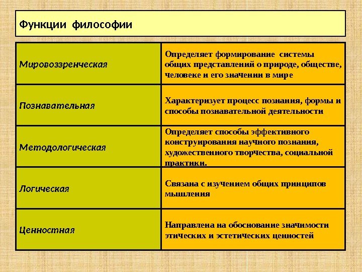 Мировоззренческая Определяет формирование системы общих представлений о природе, обществе, человеке и его значении в мире Ценностная Направлена на обоснование значимости этических и эстетических ценностей. Логическая Связана с изучением общих принципов мышления. Методологическая Определяет способы эффективного конструирования научного познания, художественного творчества, социальной практики. Познавательная Характеризует процесс познания, формы и способы познавательной деятельности. Функции философии