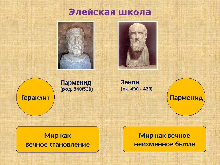 Элейская школа Парменид Мир как вечное становление Мир как вечное неизменное бытие. Гераклит Парменид (род. 540/539) Зенон (ок. 490 — 430)