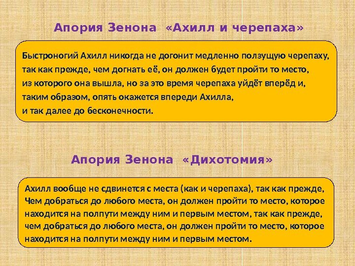 Апория Зенона «Ахилл и черепаха» Быстроногий Ахилл никогда не догонит медленно ползущую черепаху, так как прежде, чем догнать её, он должен будет пройти то место, из которого она вышла, но за это время черепаха уйдёт вперёд и, таким образом, опять окажется впереди Ахилла, и так далее до бесконечности. Апория Зенона «Дихотомия» Ахилл вообще не сдвинется с места (как и черепаха), так как прежде, Чем добраться до любого места, он должен пройти то место, которое находится на полпути между ним и первым местом, так как прежде, чем добраться до любого места, он должен пройти то место, которое находится на полпути между ним и первым местом.
