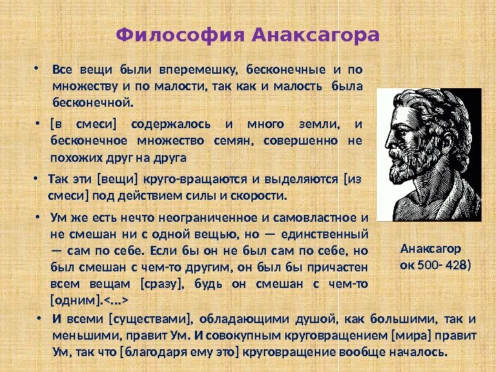Философия Анаксагора • Все вещи были вперемешку, бесконечные и по множеству и по малости, так как и малость была бесконечной. Анаксагор ок 500 — 428) • [в смеси] содержалось и много земли, и бесконечное множество семян, совершенно не похожих друг на друга • Так эти [вещи] круго-вращаются и выделяются [из смеси] под действием силы и скорости. • Ум же есть нечто неограниченное и самовласт ное и не смешан ни с одной вещью, но — единственный — сам по себе. Если бы он не был сам по себе, но был смешан с чем-то другим, он был бы причастен всем вещам [сразу], будь он смешан с чем-то [одним]. • И всеми [существами], обладающими душой, как большими, так и меньшими, правит Ум. И совокупным круговращением [мира] правит Ум, так что [благодаря ему это] круговращение вообще началось.