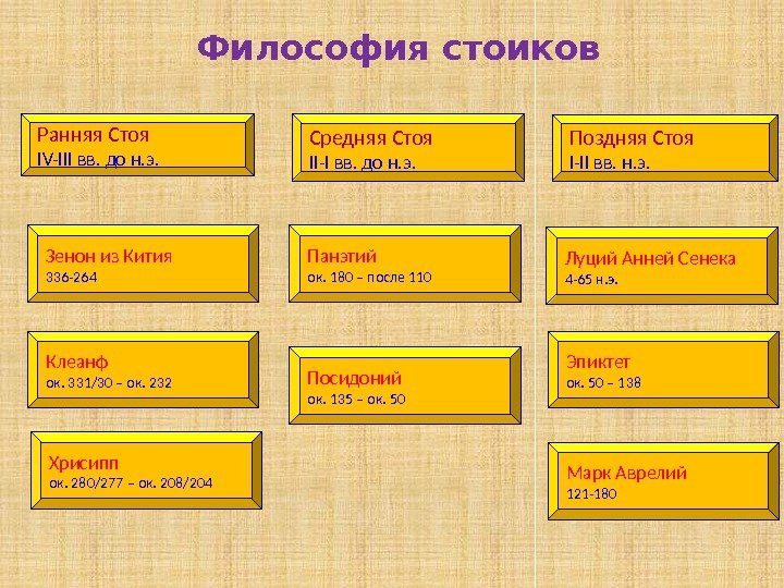 Философия стоиков Ранняя Стоя IV-III вв. до н. э. Средняя Стоя II-I вв. до н. э. Поздняя Стоя I-II вв. н. э. Зенон из Кития 336 -264 Луций Анней Сенека 4 -65 н. э. Клеанф ок. 331/30 – ок. 232 Хрисипп ок. 280/277 – ок. 208/204 Панэтий ок. 180 – после 110 Посидоний ок. 135 – ок. 50 Эпиктет ок. 50 – 138 Марк Аврелий 121 —