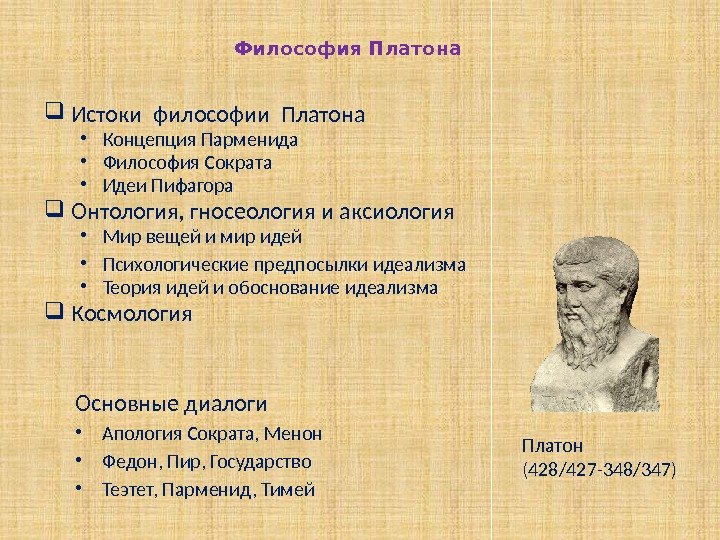 Философия Платона Истоки философии Платона • Концепция Парменида • Философия Сократа • Идеи Пифагора Онтология, гносеология и аксиология • Мир вещей и мир идей • Психологические предпосылки идеализма • Теория идей и обоснование идеализма Космология Платон (428/427 -348/347)Основные диалоги • Апология Сократа, Менон • Федон, Пир, Государство • Теэтет, Парменид, Тимей