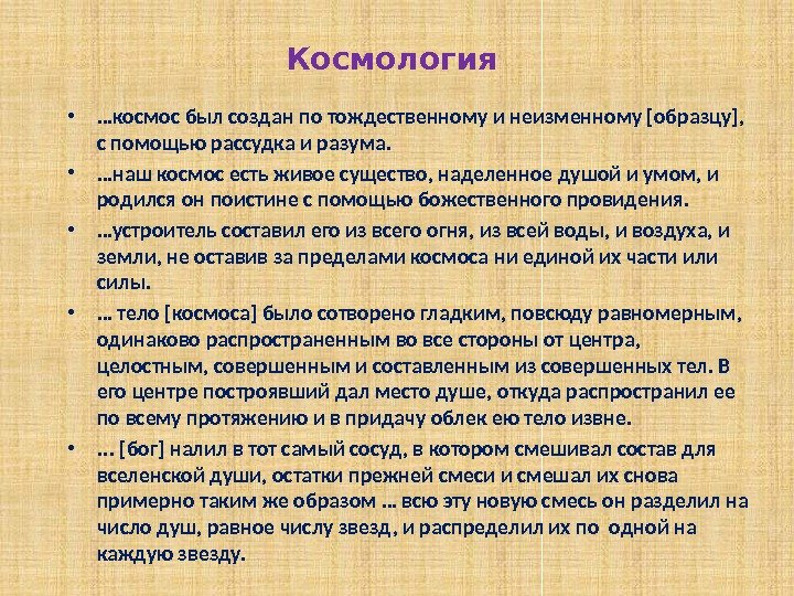 Космология • … кос мос был создан по тождественному и неизменному [образцу], с помощью рассудка и разума. • … наш космос есть живое существо, наделенное душой и умом, и родился он поистине с помощью божественного провидения. • … устроитель составил его из всего огня, из всей воды, и воздуха, и земли, не оставив за преде лами космоса ни единой их части или силы. • … тело [космоса] было сотворено гладким, повсюду равно мерным, одинаково распространенным во все стороны от центра, целостным, совершенным и составленным из совершенных тел. В его центре построявший дал место душе , откуда распространил ее по всему протяжению и в придачу облек ею тело извне. • . . . [бог] налил в тот самый сосуд, в ко тором смешивал состав для вселенской души, остатки прежней смеси и смешал их снова примерно таким же образом … всю эту новую смесь он разделил на число душ, равное числу звезд, и распределил их по одной на каждую звезду.