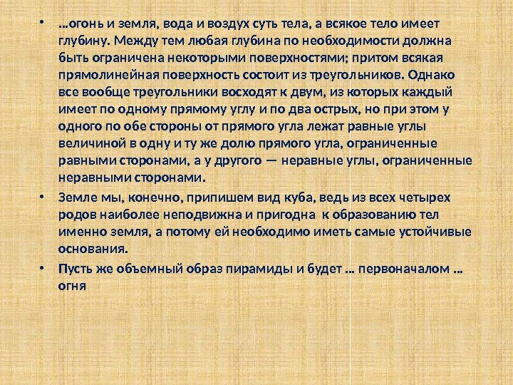 • … огонь и земля, вода и воздух суть тела, а всякое тело имеет глубину. Между тем любая глубина по необходимости должна быть ограничена некоторыми поверхностями; притом всякая прямолинейная поверхность состоит из треугольников. Однако все вообще треугольники вос ходят к двум, из которых каждый имеет по одному прямому углу и по два острых, но при этом у одного по обе стороны от прямого угла лежат равные углы величи ной в одну и ту же долю прямого угла, ограниченные равными сторонами, а у другого — неравные углы, огра ниченные неравными сторонами. • Земле мы, конечно, припишем вид куба, ведь из всех четырех родов наиболее неподвижна и пригодна к образованию тел именно земля, а потому ей необхо димо иметь самые устойчивые основания. • Пусть же объемный образ пирамиды и будет … первоначалом … огня