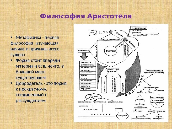 Философия Аристотеля • Метафизика — первая философия, изучающая начала и причины всего сущего • Форма стоит впереди материи и есть нечто, в большей мере существующее • Добродетель — это порыв к прекрасному, соединенный с рассуждением