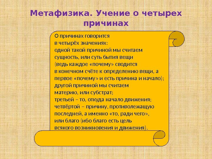 Метафизика. Учение о четырех причинах О причинах говорится в четырёх значениях: одной такой причиной мы считаем сущность, или суть бытия вещи (ведь каждое «почему» сводится в конечном счёте к определению вещи, а первое «почему» и есть причина и начало); другой причиной мы считаем материю, или субстрат; третьей – то, откуда начало движения; четвёртой – причину, противолежащую последней, а именно «то, ради чего» , или благо (ибо благо есть цель всякого возникновения и движения).