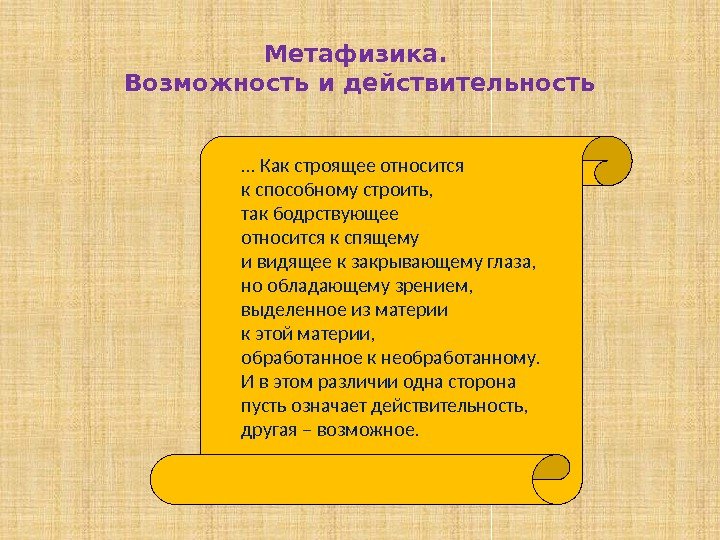 Метафизика. Возможность и действительность … Как строящее относится к способному строить, так бодрствующее относится к спящему и видящее к закрывающему глаза, но обладающему зрением, выделенное из материи к этой материи, обработанное к необработанному. И в этом различии одна сторона пусть означает действительность, другая – возможное.