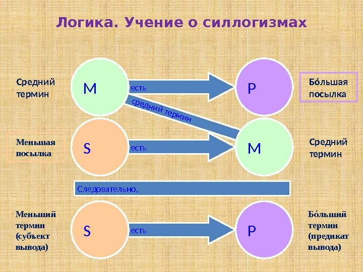 есть. Логика. Учение о силлогизмах S PСледовательно, средний термин P SM M Б óльший термин (предикат вывода)Мен ьший термин (субъект вывода) Средний термин. Бóльшая посылка Мен ьшая посылка