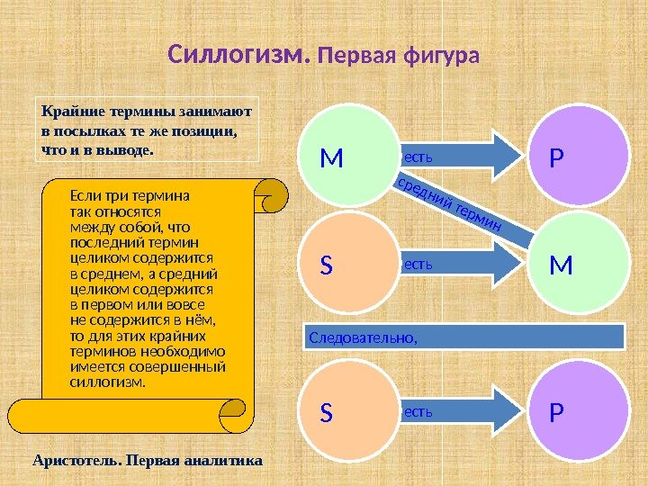 есть. Силлогизм. Первая фигура S PСледовательно, средний термин. Если три термина так относятся между собой, что последний термин целиком содержится в среднем, а средний целиком содержится в первом или вовсе не содержится в нём, то для этих крайних терминов необходимо имеется совершенный силлогизм. M P S M Аристотель. Первая аналитика Крайние термины занимают в посылках те же позиции, что и в выводе.