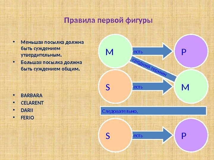 есть. Правила первой фигуры • Меньшая посылка должна быть суждением утвердительным. • Большая посылка должна быть суждением общим. • BARBARA • CELARENT • DARII • FERIO S PСледовательно, средний термин M P S M