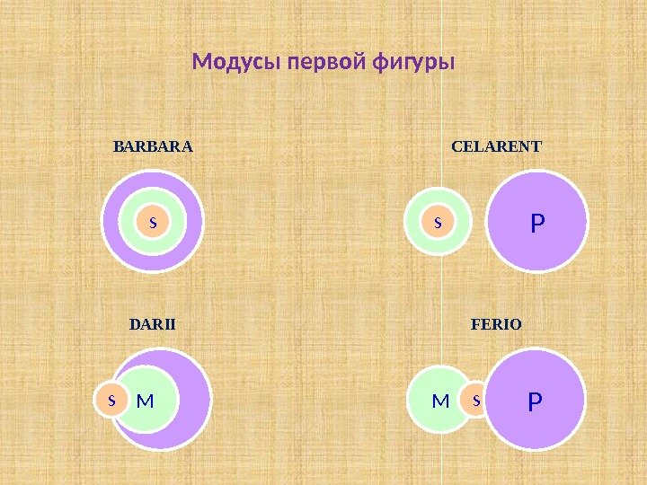MМодусы первой фигуры PM S P PM M S S BARBARA CELARENT DARII FERIO S P