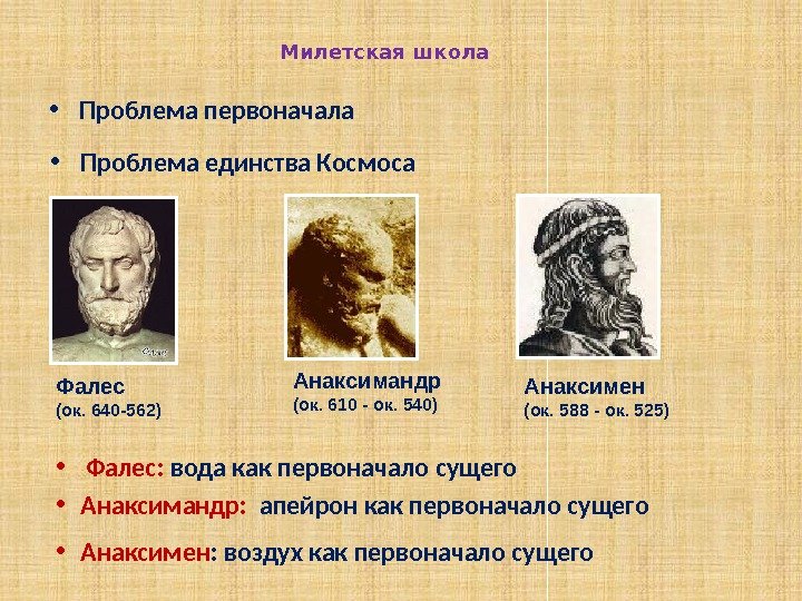 Милетская школа Фалес (ок. 640 -562) Анаксимандр (ок. 610 — ок. 540) Анаксимен (ок. 588 — ок. 525) • Фалес: вода как первоначало сущего • Проблема единства Космоса • Проблема первоначала • Анаксимандр: апейрон как первоначало сущего • Анаксимен : воздух как первоначало сущего