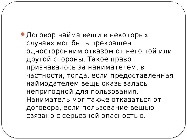 В ряде случаев имеет право прекратить договор наймодатель, а именно, если наниматель злоупотреблял своим правом пользовался вещью так, что портил ее и т. д. , если нанятая вещь требовала ремонта, а выполнение его невозможно без прекращения пользования нанимателя, наконец, если вещь оказалась необходимой для личных надобностей наймодателя. Смерть той или иной стороны не прекращала договора найма. Прекращался договор найма истечением срока, но если фактически пользование вещью со стороны нанимателя продолжалось и по окончании срока, договор считался возобновленным по молчаливому согласию сторон