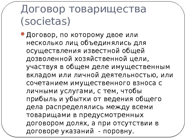 Договор товарищества (societas) Договор, по которому двое или несколько лиц объединялись для осуществления известной общей дозволенной хозяйственной цели, участвуя в общем деле имущественным вкладом или личной деятельностью, или сочетанием имущественного взноса с личными услугами, с тем, чтобы прибыль и убытки от ведения общего дела распределялись между всеми товарищами в предусмотренных договором долях, а при отсутствии в договоре указаний — поровну.