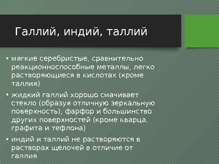 Галлий, индий, таллий • мягкие серебристые, сравнительно реакционноспособные металлы, легко растворяющиеся в кислотах (кроме таллия) • жидкий галлий хорошо смачивает стекло (образуя отличную зеркальную поверхность), фарфор и большинство других поверхностей (кроме кварца, графита и тефлона) • индий и таллий не растворяются в растворах щелочей в отличие от галлия