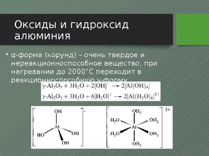 Оксиды и гидроксид алюминия • α-форма (корунд) – очень твердое и нереакционноспособное вещество, при нагревании до 2000°С переходит в реакционноспособную γ-форму
