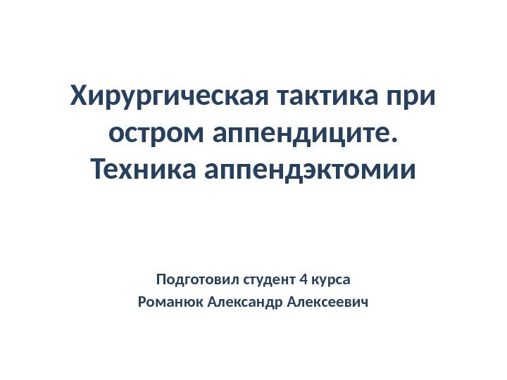 Хирургическая тактика при остром аппендиците. Техника аппендэктомии Подготовил студент 4 курса Романюк Александр Алексеевич