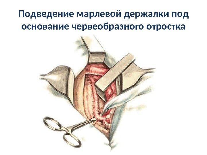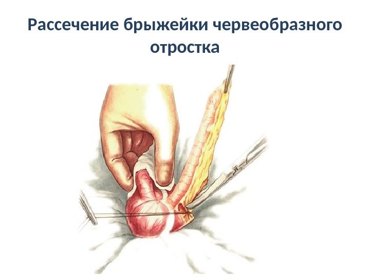 Аппендэктомия при забрюшинном положении отростка Если сращений в брюшной полости нет и отростка не находят, то следует думать о его ретроперитонеальном положении. Червеобразный отросток при этом располагается позади восходящей ободочной кишки и своей верхушкой может достигать нижнего полюса почки. При забрюшинном положении червеобразного отростка для его обнажения рассекают париетальную брюшину на протяжении 10 — 15 см, отступя на 1 см кнаружи от слепой и восходящей ободочной кишок