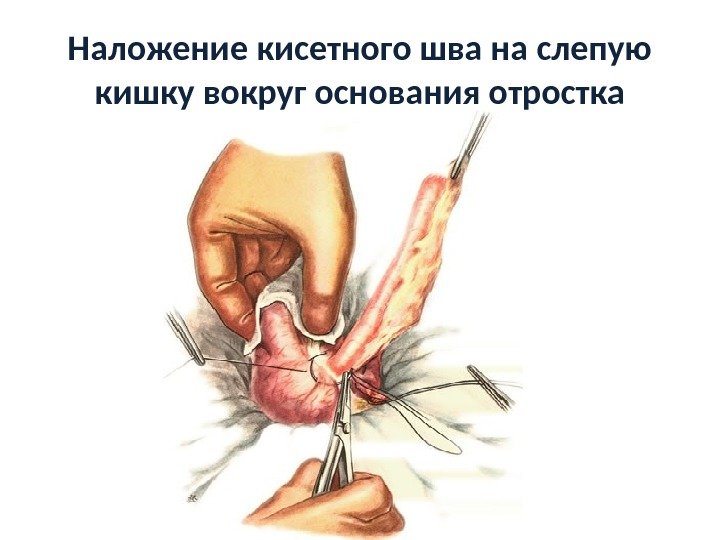 Наложение кисетного шва на слепую кишку вокруг основания отростка