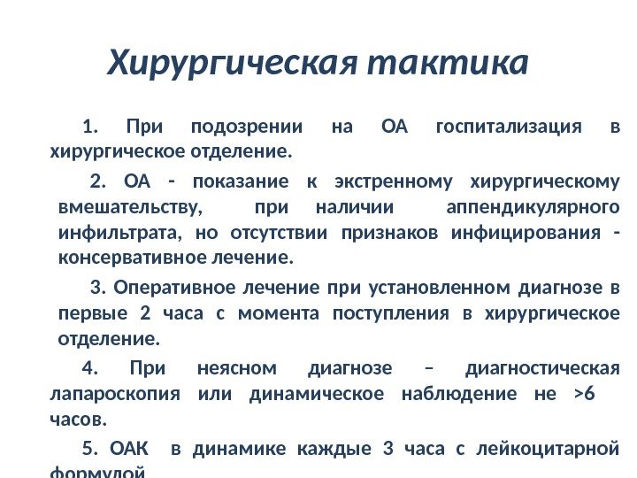 Хирургическая тактика 1. При подозрении на ОА госпитализация в хирургическое отделение. 2. ОА — показание к экстренному хирургическому вмешательству, при наличии аппендикулярного инфильтрата, но отсутствии признаков инфицирования — консервативное лечение. 3. Оперативное лечение при установленном диагнозе в первые 2 часа с момента поступления в хирургическое отделение. 4. При неясном диагнозе – диагностическая лапароскопия или динамическое наблюдение не >6 часов. 5. ОАК в динамике каждые 3 часа с лейкоцитарной формулой.