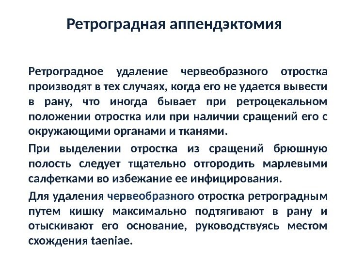 Ретроградная аппендэктомия Ретроградное удаление червеобразного отростка производят в тех случаях, когда его не удается вывести в рану, что иногда бывает при ретроцекальном положении отростка или при наличии сращений его с окружающими органами и тканями. При выделении отростка из сращений брюшную полость следует тщательно отгородить марлевыми салфетками во избежание ее инфицирования. Для удаления червеобразного отростка ретроградным путем кишку максимально подтягивают в рану и отыскивают его основание, руководствуясь местом схождения taeniae.