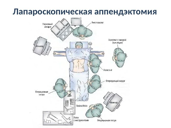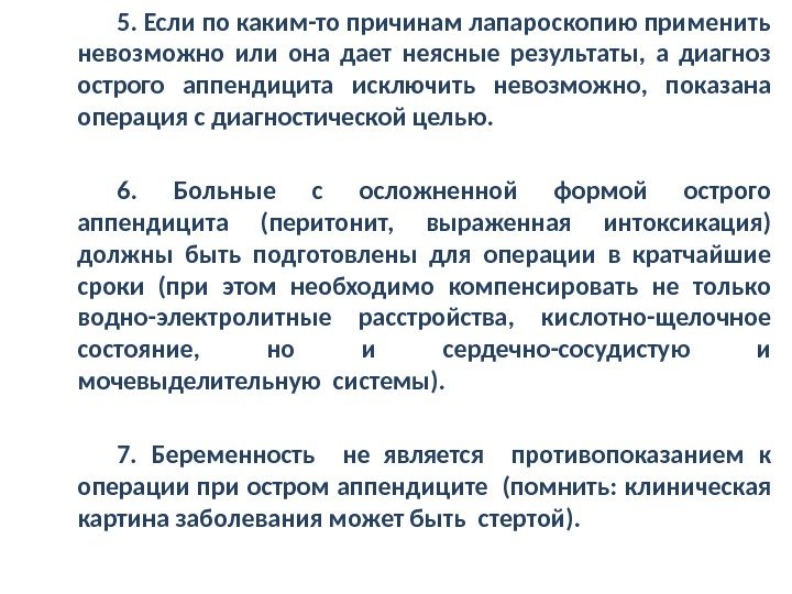 5. Если по каким-то причинам лапароскопию применить невозможно или она дает неясные результаты, а диагноз острого аппендицита исключить невозможно, показана операция с диагностической целью. 6. Больные с осложненной формой острого аппендицита (перитонит, выраженная интоксикация) должны быть подготовлены для операции в кратчайшие сроки (при этом необходимо компенсировать не только водно-электролитные расстройства, кислотно-щелочное состояние, но и сердечно-сосудистую и мочевыделительную системы). 7. Беременность не является противопоказанием к операции при остром аппендиците (помнить: клиническая картина заболевания может быть стертой).