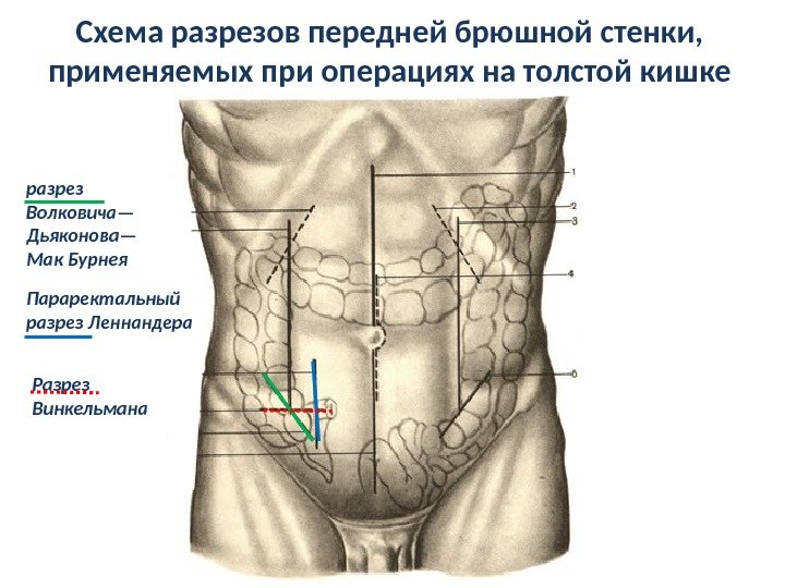 Схема разрезов передней брюшной стенки, применяемых при операциях на толстой кишке разрез Волковича— Дьяконова— Мак Бурнея Параректальный разрез Леннандера Разрез Винкельмана