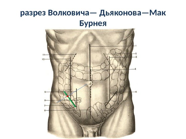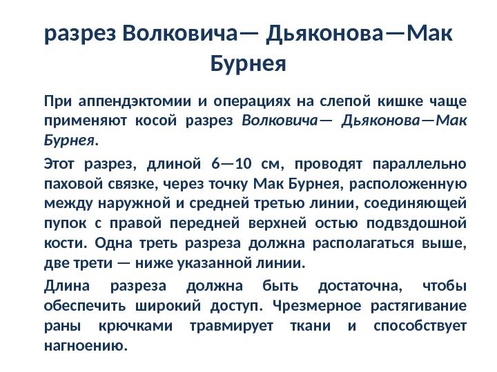 разрез Волковича— Дьяконова—Мак Бурнея При аппендэктомии и операциях на слепой кишке чаще применяют косой разрез Волковича— Дьяконова—Мак Бурнея. Этот разрез, длиной 6— 10 см, проводят параллельно паховой связке, через точку Мак Бурнея, расположенную между наружной и средней третью линии, соединяющей пупок с правой передней верхней остью подвздошной кости. Одна треть разреза должна располагаться выше, две трети — ниже указанной линии. Длина разреза должна быть достаточна, чтобы обеспечить широкий доступ. Чрезмерное растягивание раны крючками травмирует ткани и способствует нагноению.