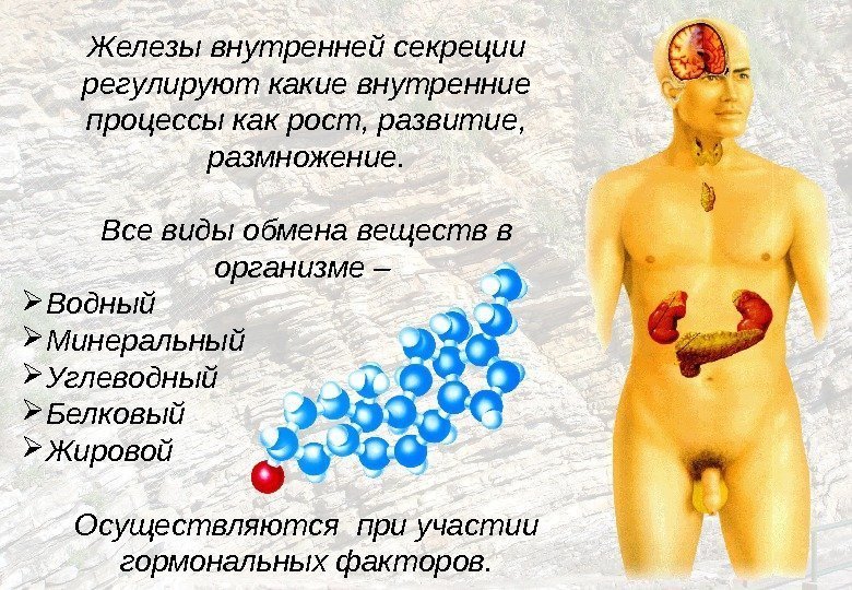 4 Железы внутренней секреции регулируют какие внутренние процессы как рост, развитие, размножение. Все виды обмена веществ в организме – Водный Минеральный Углеводный Белковый Жировой Осуществляются при участии гормональных факторов.