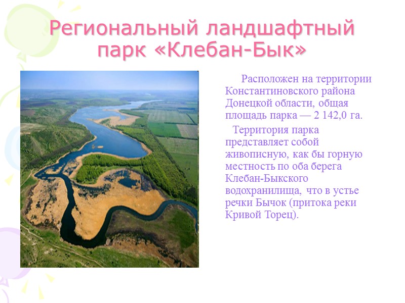 Региональный ландшафтный парк «Клебан-Бык» Расположен на территории Константиновского района Донецкой области, общая площадь парка — 2 142,0 га. Территория парка представляет собой живописную, как бы горную местность по оба берега Клебан-Быкского водохранилища, что в устье речки Бычок (притока реки Кривой Торец).