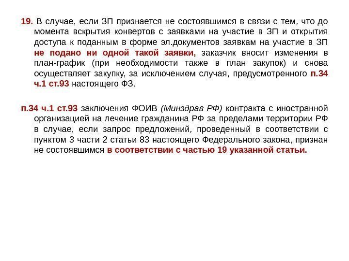19. В случае, если ЗП признается не состоявшимся в связи с тем, что до момента вскрытия конвертов с заявками на участие в ЗП и открытия доступа к поданным в форме эл. документов заявкам на участие в ЗП не подано ни одной такой заявки, заказчик вносит изменения в план-график (при необходимости также в план закупок) и снова осуществляет закупку, за исключением случая, предусмотренного п. 34 ч. 1 ст. 93 настоящего ФЗ. п. 34 ч. 1 ст. 93 заключения ФОИВ (Минздрав РФ) контракта с иностранной организацией на лечение гражданина РФ за пределами территории РФ в случае, если запрос предложений, проведенный в соответствии с пунктом 3 части 2 статьи 83 настоящего Федерального закона, признан не состоявшимся в соответствии с частью 19 указанной статьи.