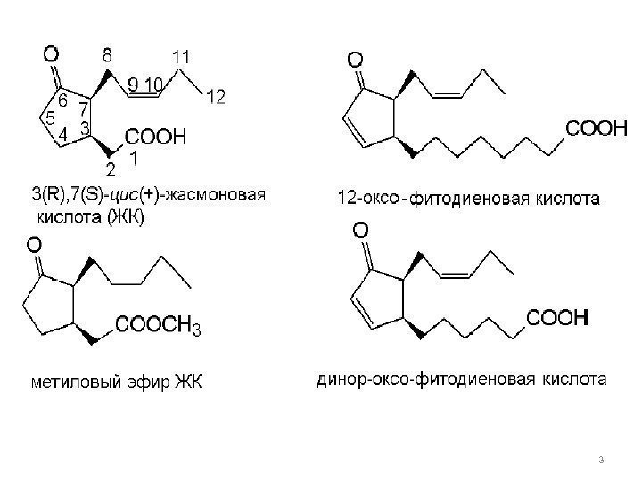 Физиологическая роль. Устойчивость растений к патогенам и насекомым-фито фагам Устойчивость к осмотическому стрессу и засухе Устойчивость к повреждению ультрафиоле- том и озоном Устойчивость к поранению и элиситорам индукция экспрессии генов в условиях биотического стрессаиндуцируют старение подавляют прорастани е семянконтролируют развитие пыльцы и растрескивани е пыльников, участвуют в регуляции формировани я клубней и луковиц, рост корня и созревания плодов