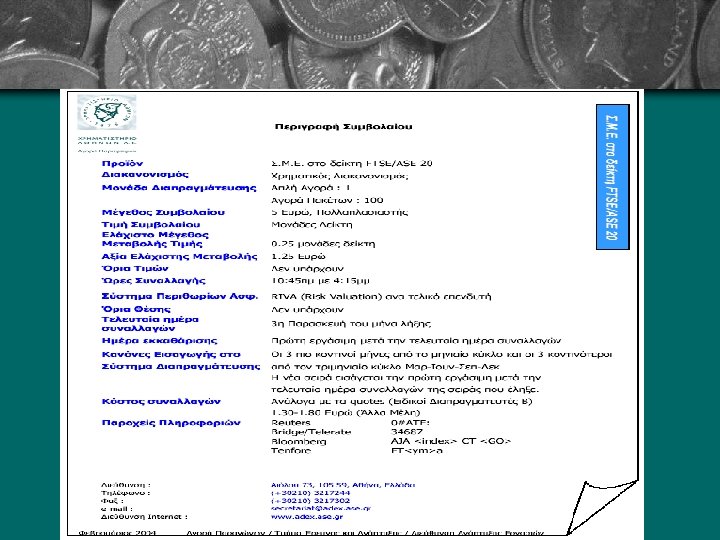 ΣΜΕ στον FTSE/ASE-20 27/8/1999 • Υποκείμενη αξία: ο δείκτης FTSE/ASE-20 • Ο δείκτης είναι βασισμένος στις 20 εταιρίες του ΧΑΑ με την υψηλότερη κεφαλαιοποίηση • Η κεφαλαιοποίηση των 20 εταιριών ξεπερνά το 50% της συνολικής κεφαλαιοποίησης