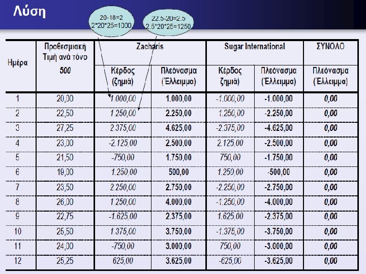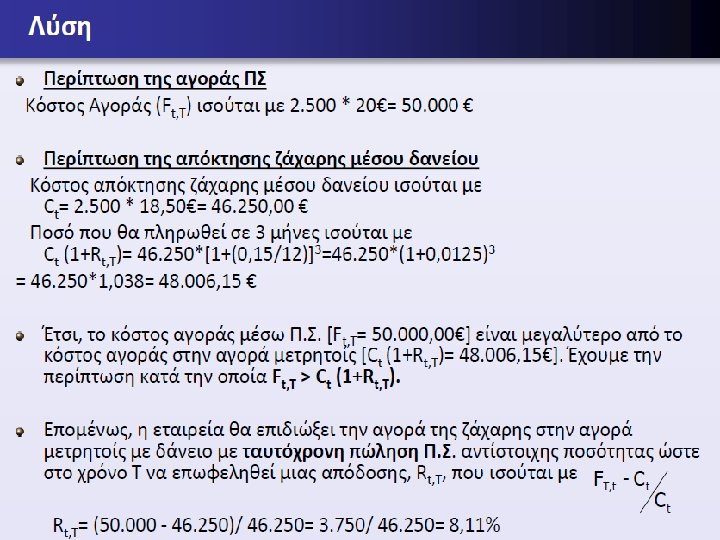 Λύση • Τα δεδομένα που διαθέτουμε είναι τα εξής: Κάθε συμβόλαιο: 25 μετρικοί τόνοι Ελάχιστο περιθώριο ασφάλισης: 6, 5% • Αγορά από την ελληνική εταιρεία Zacharis: 20 προθεσμιακά • συμβόλαια (Π. Σ. ) • Διάρκεια: 2 μήνες • Τιμή ζάχαρης από την νότια αμερικάνικη εταιρεία: 18, 00 € • Με βάση τα δεδομένα αυτά θα έχουμε: • Αξία κλειδώματος μέσω του προθεσμιακού συμβολαίου: • 18*20*25= 9. 000, 00 € • Καταβολή κάθε συναλλασσομένου σε εγγυητικό λογ/μό: • 9. 000*0, 065= 585, 00 €