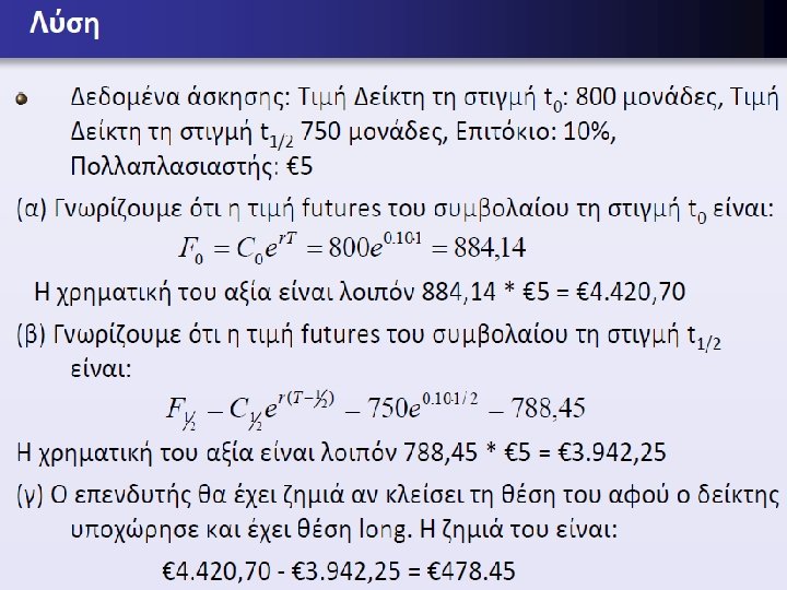 Παράδειγμα 5 • Ένας επενδυτής παίρνει θέση long σε ένα Συμβόλαιο Μελλοντικής Εκπλήρωσης (Futures Contract) διάρκειας ενός έτους πάνω στο δείκτη FTSE/ASE-20 όταν το ύψος του δείκτη είναι 800 μονάδες και το επιτόκιο είναι 10% με συνεχή ανατο κισμό. Ο πολλαπλασιαστής στο παραπάνω συμβόλαιο είναι € 5. α) Ποια η αρχική (χρηματική) αξία του Futures Contract; β) Αν μετά 6 μήνες η τιμή του δείκτη είναι 750 μονάδες και το επιτόκιο έχει παραμείνει το ίδιο ποια είναι τότε η (χρηματική) αξία του Futures Contract; γ) Αν ο επενδυτής κλείσει τη θέση του εκείνη τη στιγμή ποιο το κέρδος ή η ζημία του;