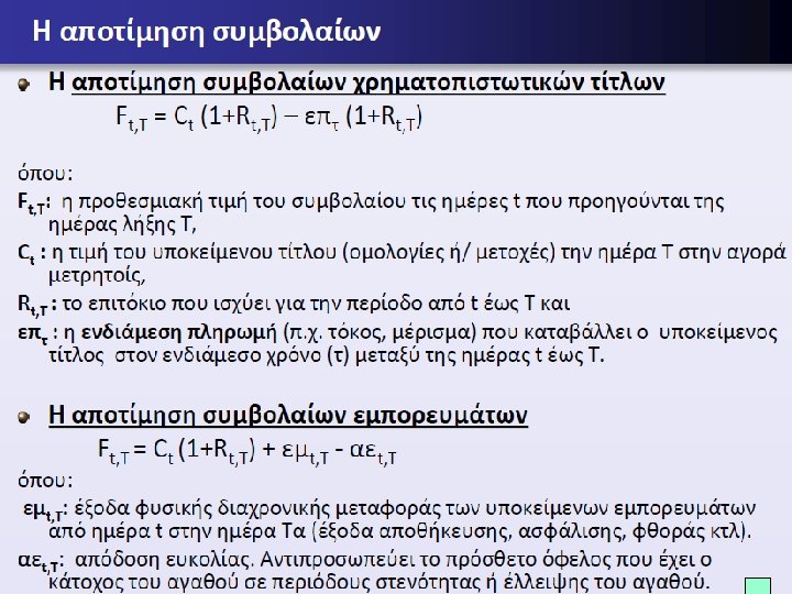 Αποτίμηση Προθεσμιακών Συμβολαίων Κανόνας της μοναδιαίας τιμής : Όμοια στοιχειώδη αγαθά ή τίτλοι που είναι διαπραγματεύσιμοι σε περισσότερες από μια αγορές θα έχουν μία και μοναδιαία τιμή, λαμβάνοντας υπόψη το κόστος μεταφοράς από την μια αγορά στην άλλη. Στην οικονομία, ο νόμος της μιας τιμής επιβάλλεται μέσω του μηχανισμού προσφοράς και ζήτησης. Στην χρηματοοικονομική, ο νόμος αυτός επιβάλλεται μέσω μιας διαδικασίας που ονομάζεται εξισορροπητική αγοραπωλησία. Εξισορροπητική αγοραπωλησ ία (arbitrage): Διαδικασία αγοράς ενός αγαθού ή τίτλου σε μια αγορά και η ταυτόχρονη πώλησή του σε μια άλλη αγορά με υψηλότερη τιμή, με στόχο την αποκόμιση κέρδους χωρίς επένδυση. Εξισορροπητική αγοραπωλησ ία στις αγ ορές παραγώγων : αγορά (ή πώληση) του στοιχειωδούς τίτλου και ταυτόχρονη πώληση (ή αγορά) του παράγωγου τίτλου που αντιστοιχεί στην ίδια ποσότητα.