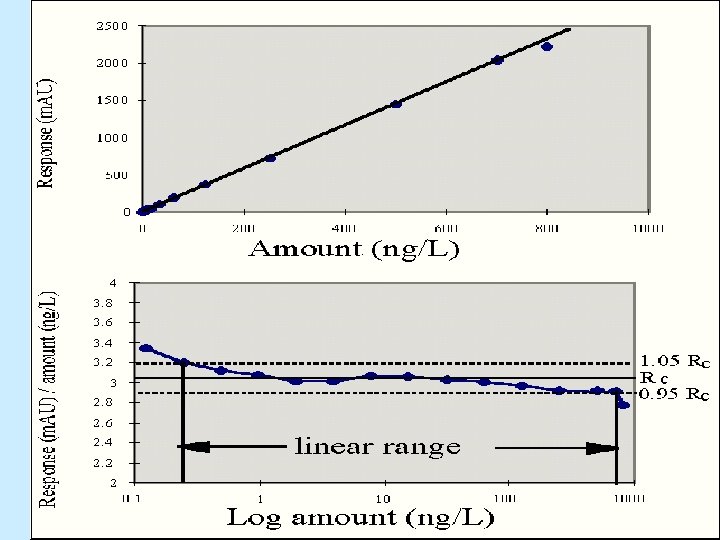 ΓΡΑΜΜΙΚΟΤΗΤΑ – ΠΟΡΕΙΑ ΕΛΕΓΧΟΥ (3) Εκτός από το διάγραμμα y ως προς x (διάγραμμα απόκρισης) γίνεται και το διάγραμμα του λόγου (απόκριση / συγκεντρωση) (response ratio) (yάξονας) ως προς συγκέντρωση (x – άξονας). Ελέγχεται να είναι μία ευθεία γραμμή. Εάν στο διάγραμμα απόκρισης – συγκέντρωσης, η τομή (intercept, a) είναι σημαντικά διαφορετική από το μηδέν (t-test, a/Sa), πρώτα αφαιρείται από κάθε απόκριση η τομή και στη συνέχεια διαιρείται με τη συγκέντρωση.