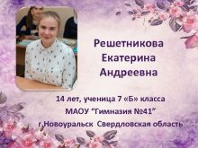 Решетникова Екатерина Андреевна 14 лет ученица 7 Б
