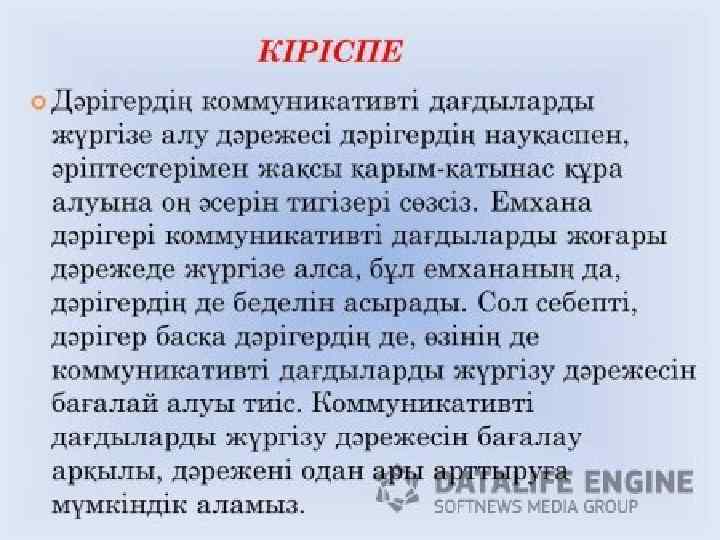Бұл өз алдына клиникалық мәліметтерді жинау мен анализ жасау жағдайын жеңілдетеді және емдік профилактикалық шаралардың тиімділігіне тікелей ықпал етеді. Дәрігерге қажетті коммуникативті дағдылар тізімі көлемді болып келеді. Ол өзіне вербальді, сондай-ақ вербальсіз коммуникация әдістерін, өзін өзі ұғуын және өзін өзі ұстауын тереңдету мен тұлғааралық қарым қатынасты жақсарту әдістерін қосады. Бұған белсенді тыңдау, сараланған сұрақтарды қою, білікті ақпарат беру және науқасқа потенциалды зақым келтіреін мәліметтерді сақтықпен жеткізу сияқты психологиялық техникалар жатады.