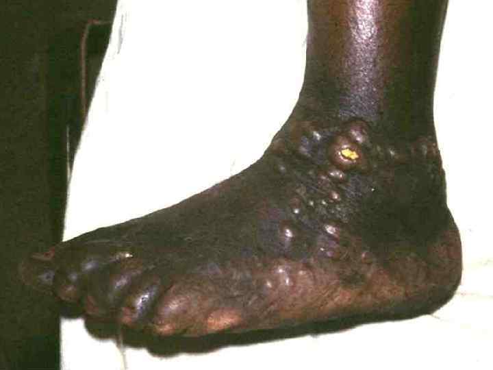 § Сирек табан гиперкератоз, онихия анықталады. Жиі өкпе, сүйек, лифа түйіндері, сүйек миына метастаз береді. Нерв жүйесінің зақымдауынан менингит, менингоэнцефалит дамиды, пневмония, сепсис летальный исходта пайда болуы мүмкін.