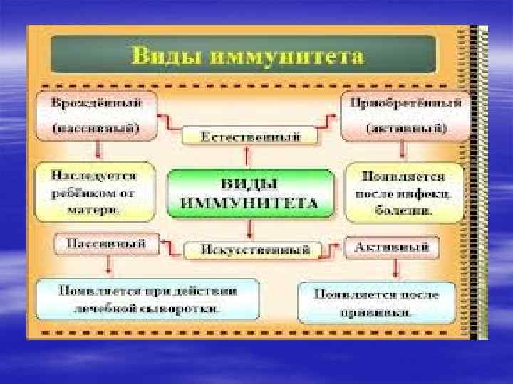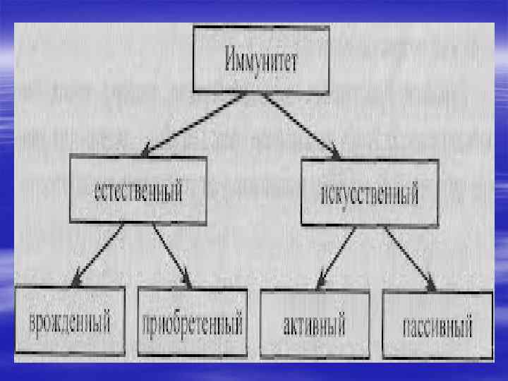 § Жалпы иммунитеттің бірнеше түрлерін ажыратады. Оны мына схемадан көруге болады: Табиғи немесе туа пайда болған иммунитет— адамдар және жануарлардың белгілі бір түріне тән. Ол түқым қуалайды. Бұдан мүйізді ірі қара малдың — жылқының маңқасымен, жылқының, иттің обасымен, адамның ит пен шошқа обасымен ауырмауы мысал бола алады. Түрлі иммунитет бір мезгілде бірнеше зиянды әсерге қарсы әсер ете алады.