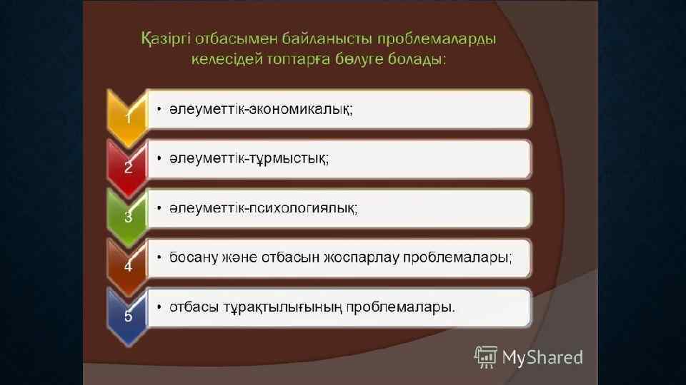 Отбасының құрылымы мен қызметтері • Отбасының бірінші міндеті - ұрпақ жалғастыру қызметті. Бұл барлық тарихи кезеңдерде қоғам үшін де, жеке адам үшін де маңызды қызметті болып келеді. Біраұбайлардың жқ балалы болу тілегі, қоғамның қай кезеңінде болмасын, оны қанағаттандыратын әлеуметтік жағдайларға сәйкес өзгеріп отырған, қазіргі д солай. • Отбасының екінші маңызды қызметі - материалдық – экономикалық және тұрмыстық - шаруашылық мәселелері. Отбасының бұл қызметті қазіргі уақытта бірінші орынға көтеріледі, себебі халықтың әлеуметт жағдайы төмендеп кетті. Сонымен бірге отбасы мүшелерінің экономикалық тәуелділігі артты. , әсіресе көп балалы отбасында. • Отбасының қызметтерінің бірі – тәрбиелеушілік қызметі: оны қоғамдық тәрбиенің ең тиімді деген жүйесі де алмастыра алмайды. Оның негізгісі – баланы өмірге келтіру ғана емес, сонымен бірге оған әлеуметтік мәдени ортаның құндылығын қабылдаттыру, үлкен ұрпақтың тәжірбиесін жас ұрпақа жеткізу, бойына сіңіру, яғни балаларын өздерін қоршаған ортаға және қоғамға пайдалы азамат етіп өсіру әке – шешенің маңызды міндетті.