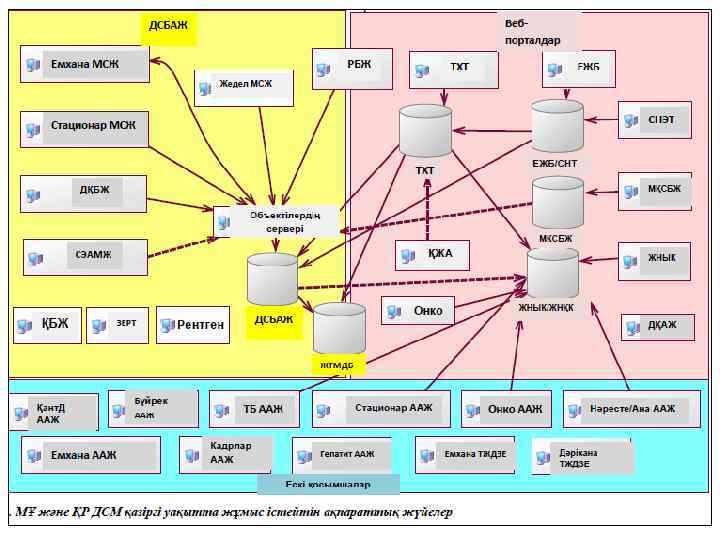 Қазақстан Республикасының денсаулық сақтау саласын ақпараттандырудың ағымдағы ахуалы • 1990 -шы жылдардан бастап Қазақстан Республикасы Денсаулық сақтау министрлігі денсаулық сақтаудың статистикалық және талдау ақпараттарын жинақтауға бағытталған бірнеше ақпараттық жүйелерді әзірлеуді және енгізуді қамтамасыз етті. Осы бағдарламалық кешендер бекітілген есепке алу-есептілік құжаттарға сәйкес деректердің жиналуын қамтамасыз етті және ол Қазақстан Республикасының көптеген өңірлерінде пайдалануда • 2005 жылы ҚР ДСМ ДСБАЖ әзірлеп, енгізе бастады. ДСБАЖ ақпараттық және технологиялық платформасының басты мақсаты қоғамның экономикалық, әлеуметтік, техникалық, технологиялық даму деңгейіне сәйкес келетін және халыққа медициналық көмекті анағұрлым сапалы ұсынуда денсаулық сақтау ресурстарын оңтайлы пайдалануын қамтамасыз ететін Қазақстан Республикасы денсаулық сақтауының ақпаратты құрылымын құру болып табылады