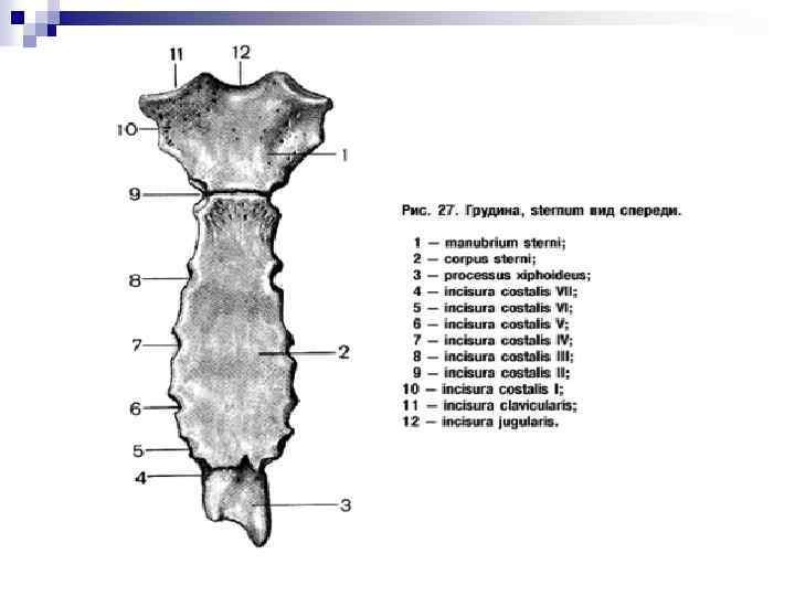Төссүйек - sternum Пішіні жағынан қанжарға ұқсайтын төссүйек үш бөліктен тұрады: жоғарғы бөлігі– тұтқасы, ортаңғы бөлігі –денесі және төменгі бөлігісемсертәрізді өсінді. Саптың жоғарғы жиегінде мойындырық тілігі орналасады; оның бүйірлерінде әрбір жағында біреуден бұғана тілігі болады, олар бұғананың төстік шетімен буындасады. Тұтқаның төменгі жиегі дененің жоғарғы жиегі өзара алға қарай шығыңқы төс бұрышы деп аталады. Төс денесінің жиегінде қабырғалық тіліктер жатады, олар екінші қабырғадан бастап шеміршекпен буындасады.