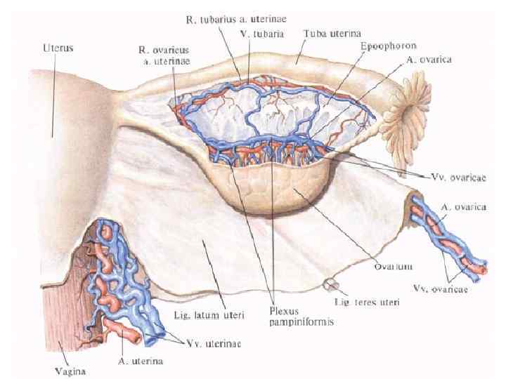 Аналық жыныс безі, жатыр түтігі және жатыр 1 — жатыр түбі; 2 — жатыр түтігінің құйғыш бөлігі; 3 — аналық жыныс меншікті байламалары; 4 — аналық жыныс безінің шажырақайы; 5 — жатыр түтігінің ампуласы; 6 — жатыр түтігінің шашақтары; 7 — жатыр түтігінің кенейген ұшы; 8 — жатыр денесі; 9 — аналық жыныс безі; 10 — аналық жыныс байламасы; 11 — жатыр мойыны; 12 — жатырдың домалақ байламасы; 13 — жатырдың жалпақ байламасы; 14 — қынап: